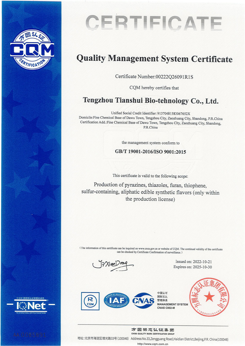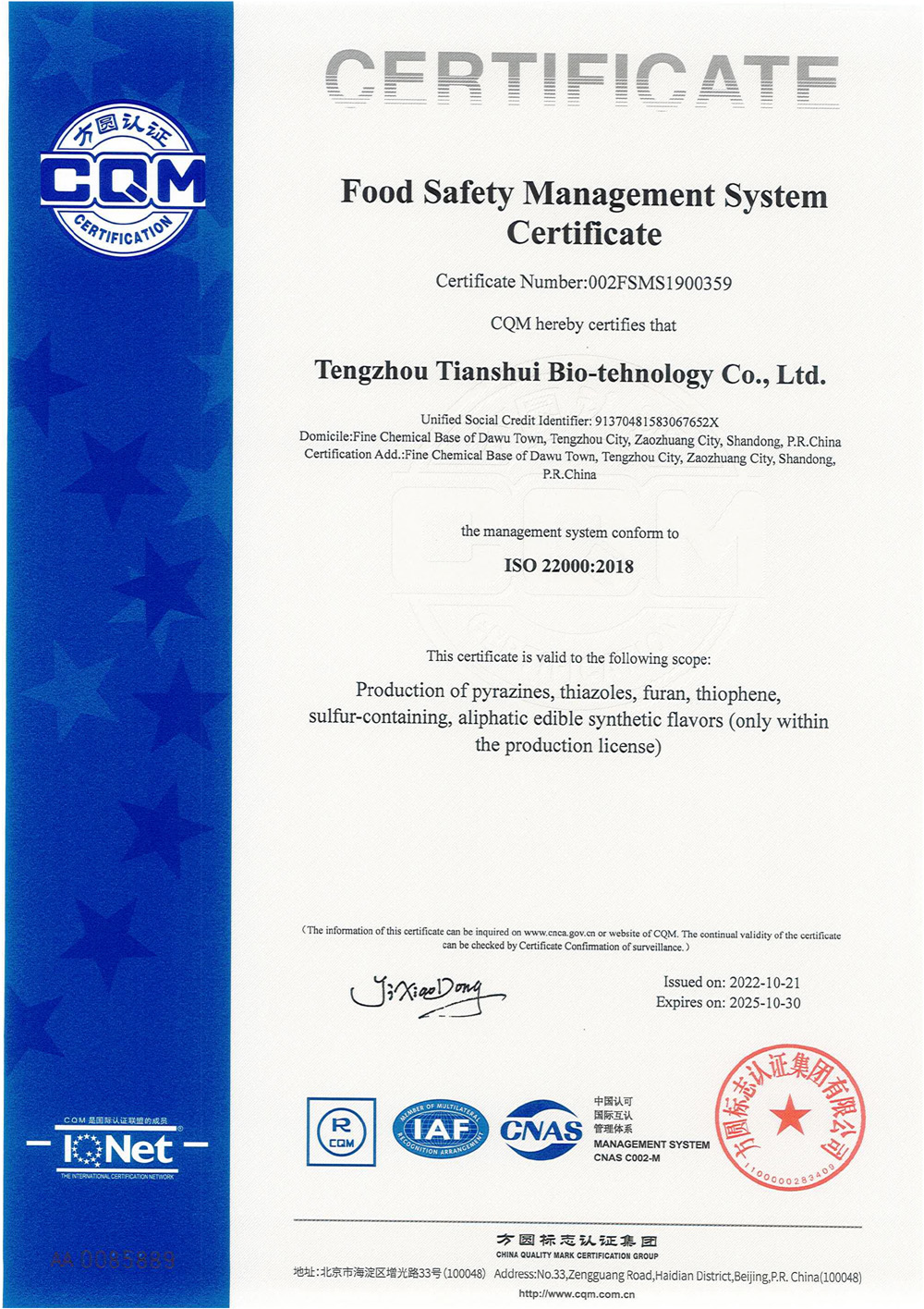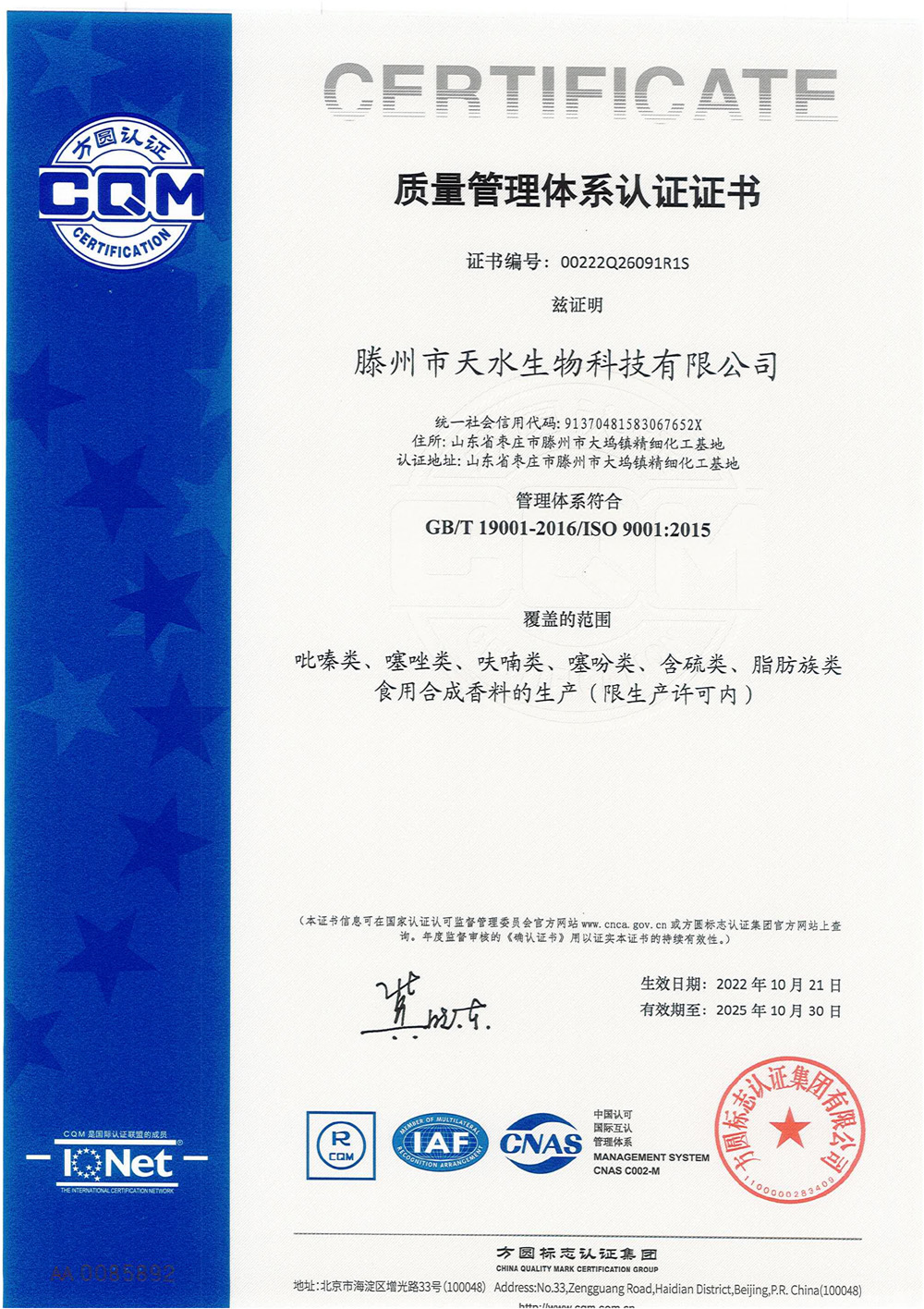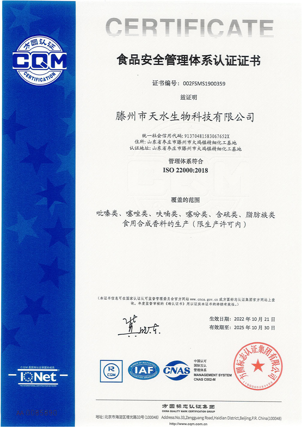 滕州市天水生物科技有限公司成立于2011年9月,是目前國內(nèi)雜環(huán)類合成食品香料、日化香料和醫(yī)藥中間體生產(chǎn)經(jīng)營的綜合性企業(yè)。坐落于山東省滕州市生物醫(yī)藥產(chǎn)業(yè)基地,總投資5000余萬元,占地面積約30000平方米,員工百余人。公司先后被評(píng)為高新技術(shù)企業(yè)、專精特新中小企業(yè)、科技型中小企業(yè),建有市級(jí)重點(diǎn)實(shí)驗(yàn)室1處,并先后獲得ISO9001質(zhì)量體系認(rèn)證、ISO22000食品安全體系認(rèn)證、kosher認(rèn)證和Halal認(rèn)證。是香精香料及食品配料協(xié)會(huì)會(huì)員單位及滕州市中小企業(yè)協(xié)會(huì)理事單位。